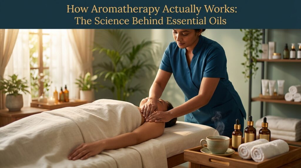 If you’re someone who takes your wellness seriously — who reads ingredient labels, thinks in terms of doshas, and approaches self-care with genuine curiosity rather than trend-chasing — you’ve probably wondered whether aromatherapy is real medicine or just a pleasant ritual. The answer, grounded in neuroscience, is more interesting than either option. Understanding how aromatherapy works changes everything about how you experience it. It transforms a “nice-smelling massage” into a precise, physiological intervention — one that your body has been biologically primed to receive for thousands of years, long before anyone gave it a clinical name.
