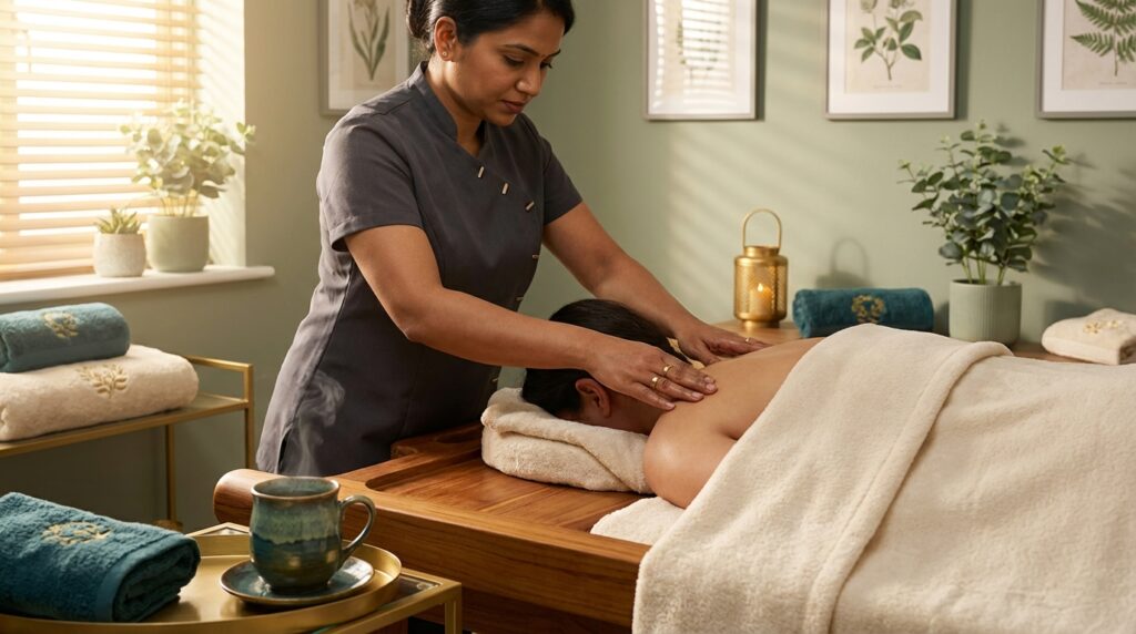 Many guests describe a distinct heaviness lifting from behind the eyes within the first few minutes. The nervous system, which has been running at high alert through back-to-back meetings and deadline pressure, begins to genuinely downshift. If you want to understand the physiological depth of what this technique achieves, the Indian Head Massage technique for nervous system reset goes into considerable detail on why this works beyond surface relaxation.